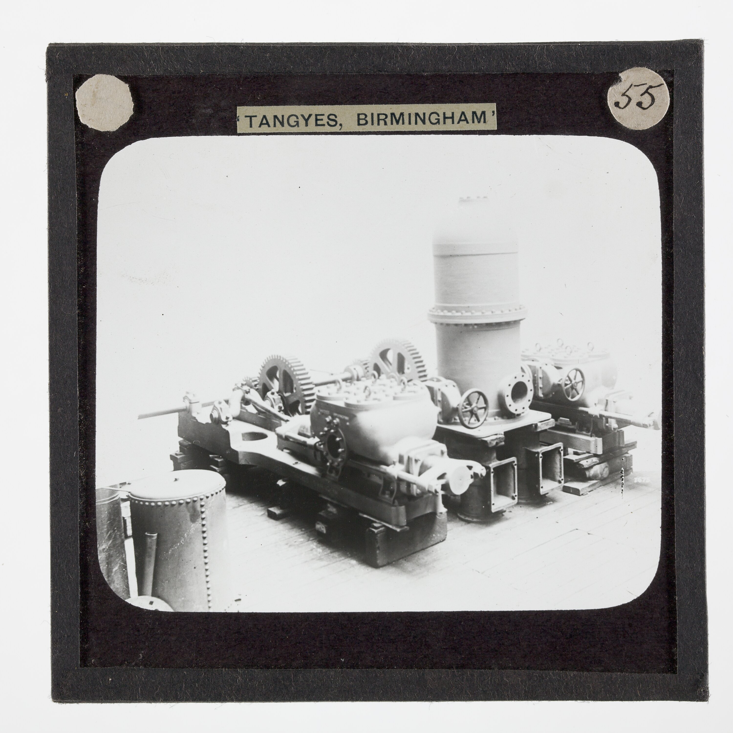 One of 239 glass lantern slides depicting products manufactured by Tangyes Limited engineers of Birmingham, England. The images include various products such as engines, centrifugal pumps, hydraulic pumps, gas producers, materials testing machines, presses, machine tools, hydraulic jacks etc. Tangyes was a company which operated from 1857 to 1957. They produced a wide variety of engineering products exported worldwide including Australia and other British colonies.