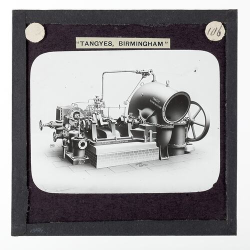 One of 239 glass lantern slides depicting products manufactured by Tangyes Limited engineers of Birmingham, England. The images include various products such as engines, centrifugal pumps, hydraulic pumps, gas producers, materials testing machines, presses, machine tools, hydraulic jacks etc. Tangyes was a company which operated from 1857 to 1957. They produced a wide variety of engineering products exported worldwide including Australia and other British colonies.