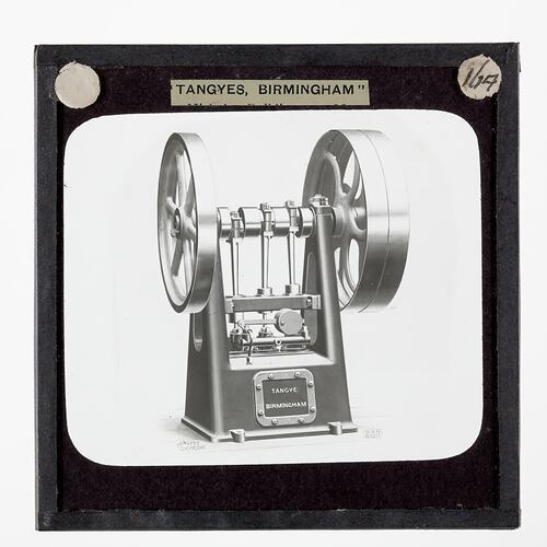 One of 239 glass lantern slides depicting products manufactured by Tangyes Limited engineers of Birmingham, England. The images include various products such as engines, centrifugal pumps, hydraulic pumps, gas producers, materials testing machines, presses, machine tools, hydraulic jacks etc. Tangyes was a company which operated from 1857 to 1957. They produced a wide variety of engineering products exported worldwide including Australia and other British colonies.