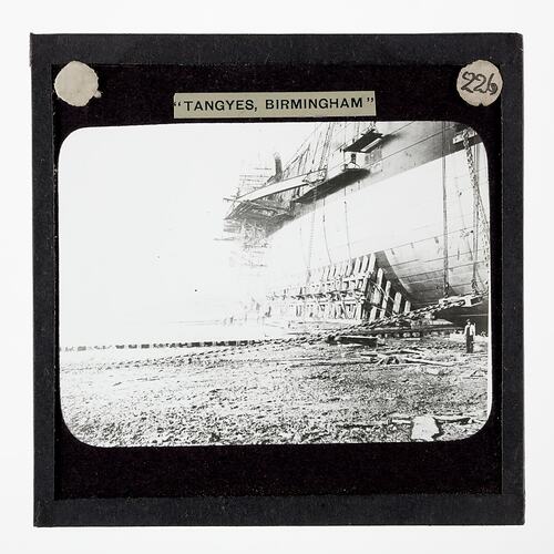 Standard format (3¼ x 3¼ inch square) lantern slide, comprising black & white photographic image printed on glass with black paper rectangular round cornered mask against image under protective glass cover plate; sealed with black paper binding tape around edge.