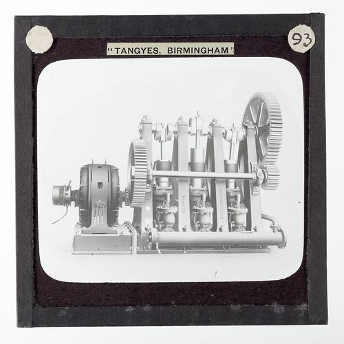 One of 239 glass lantern slides depicting products manufactured by Tangyes Limited engineers of Birmingham, England. The images include various products such as engines, centrifugal pumps, hydraulic pumps, gas producers, materials testing machines, presses, machine tools, hydraulic jacks etc. Tangyes was a company which operated from 1857 to 1957. They produced a wide variety of engineering products exported worldwide including Australia and other British colonies.
