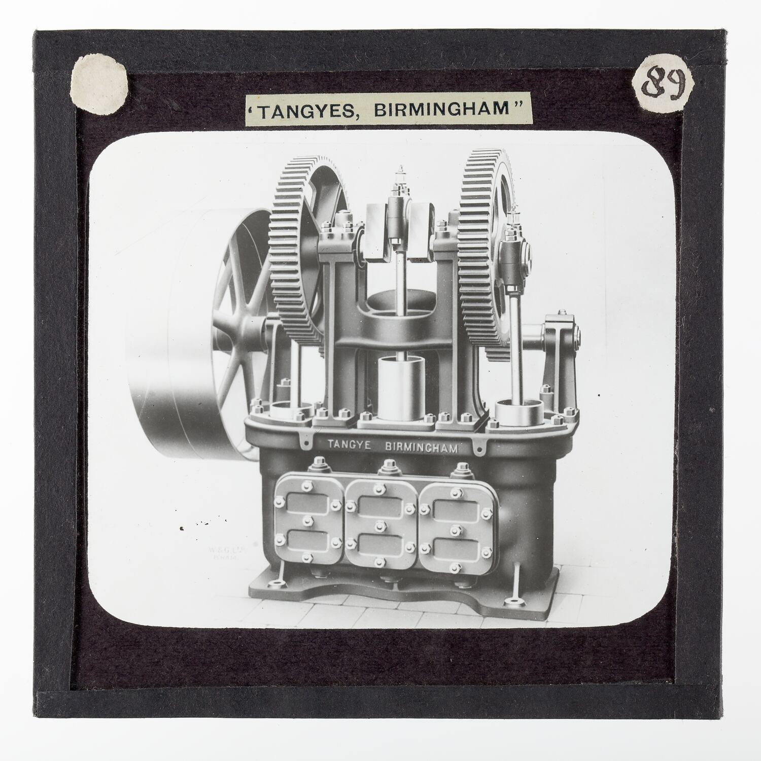 One of 239 glass lantern slides depicting products manufactured by Tangyes Limited engineers of Birmingham, England. The images include various products such as engines, centrifugal pumps, hydraulic pumps, gas producers, materials testing machines, presses, machine tools, hydraulic jacks etc. Tangyes was a company which operated from 1857 to 1957. They produced a wide variety of engineering products exported worldwide including Australia and other British colonies.
