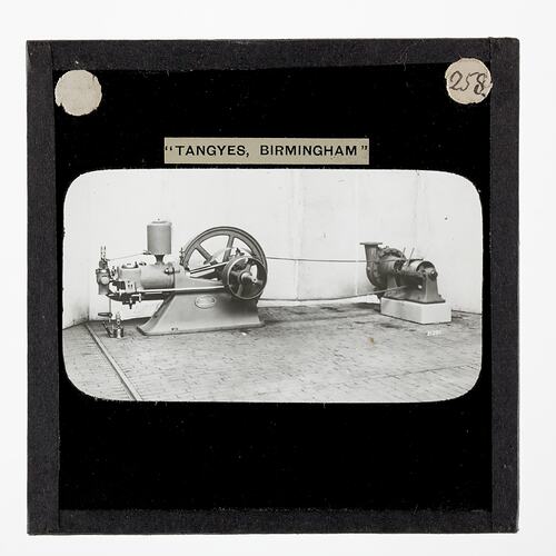 One of 239 glass lantern slides depicting products manufactured by Tangyes Limited engineers of Birmingham, England. The images include various products such as engines, centrifugal pumps, hydraulic pumps, gas producers, materials testing machines, presses, machine tools, hydraulic jacks etc. Tangyes was a company which operated from 1857 to 1957. They produced a wide variety of engineering products exported worldwide including Australia and other British colonies.