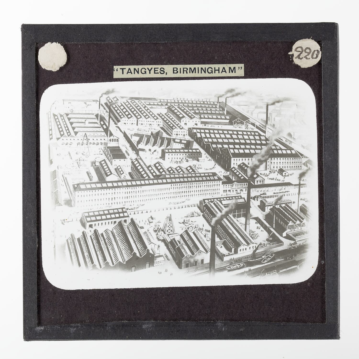 Standard format (3¼ x 3¼ inch square) lantern slide, comprising black & white photographic image printed on glass with black paper rectangular round cornered mask against image under protective glass cover plate; sealed with black paper binding tape around edge.