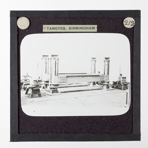 One of 239 glass lantern slides depicting products manufactured by Tangyes Limited engineers of Birmingham, England. The images include various products such as engines, centrifugal pumps, hydraulic pumps, gas producers, materials testing machines, presses, machine tools, hydraulic jacks etc. Tangyes was a company which operated from 1857 to 1957. They produced a wide variety of engineering products exported worldwide including Australia and other British colonies.