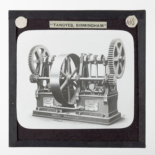 One of 239 glass lantern slides depicting products manufactured by Tangyes Limited engineers of Birmingham, England. The images include various products such as engines, centrifugal pumps, hydraulic pumps, gas producers, materials testing machines, presses, machine tools, hydraulic jacks etc. Tangyes was a company which operated from 1857 to 1957. They produced a wide variety of engineering products exported worldwide including Australia and other British colonies.