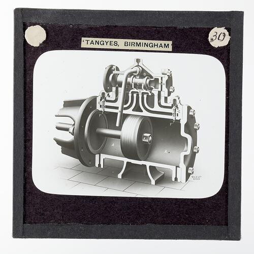 One of 239 glass lantern slides depicting products manufactured by Tangyes Limited engineers of Birmingham, England. The images include various products such as engines, centrifugal pumps, hydraulic pumps, gas producers, materials testing machines, presses, machine tools, hydraulic jacks etc. Tangyes was a company which operated from 1857 to 1957. They produced a wide variety of engineering products exported worldwide including Australia and other British colonies.