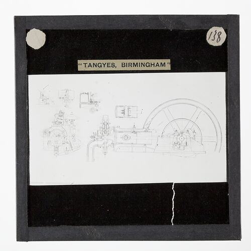 One of 239 glass lantern slides depicting products manufactured by Tangyes Limited engineers of Birmingham, England. The images include various products such as engines, centrifugal pumps, hydraulic pumps, gas producers, materials testing machines, presses, machine tools, hydraulic jacks etc. Tangyes was a company which operated from 1857 to 1957. They produced a wide variety of engineering products exported worldwide including Australia and other British colonies.