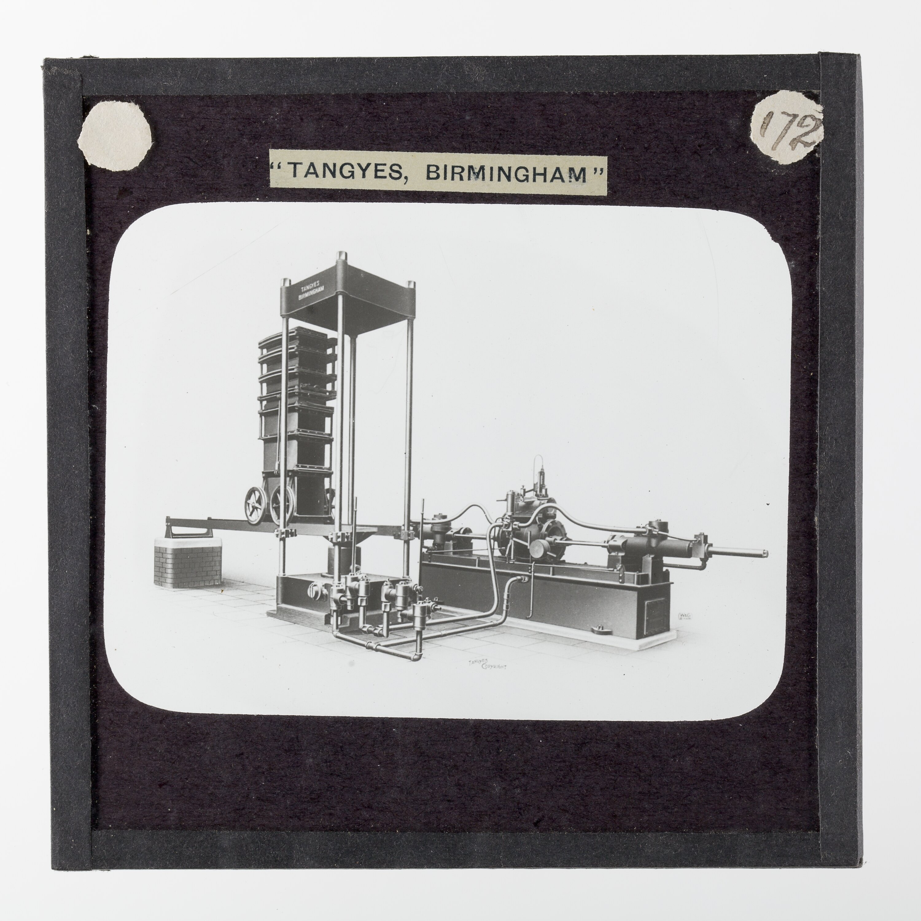 One of 239 glass lantern slides depicting products manufactured by Tangyes Limited engineers of Birmingham, England. The images include various products such as engines, centrifugal pumps, hydraulic pumps, gas producers, materials testing machines, presses, machine tools, hydraulic jacks etc. Tangyes was a company which operated from 1857 to 1957. They produced a wide variety of engineering products exported worldwide including Australia and other British colonies.