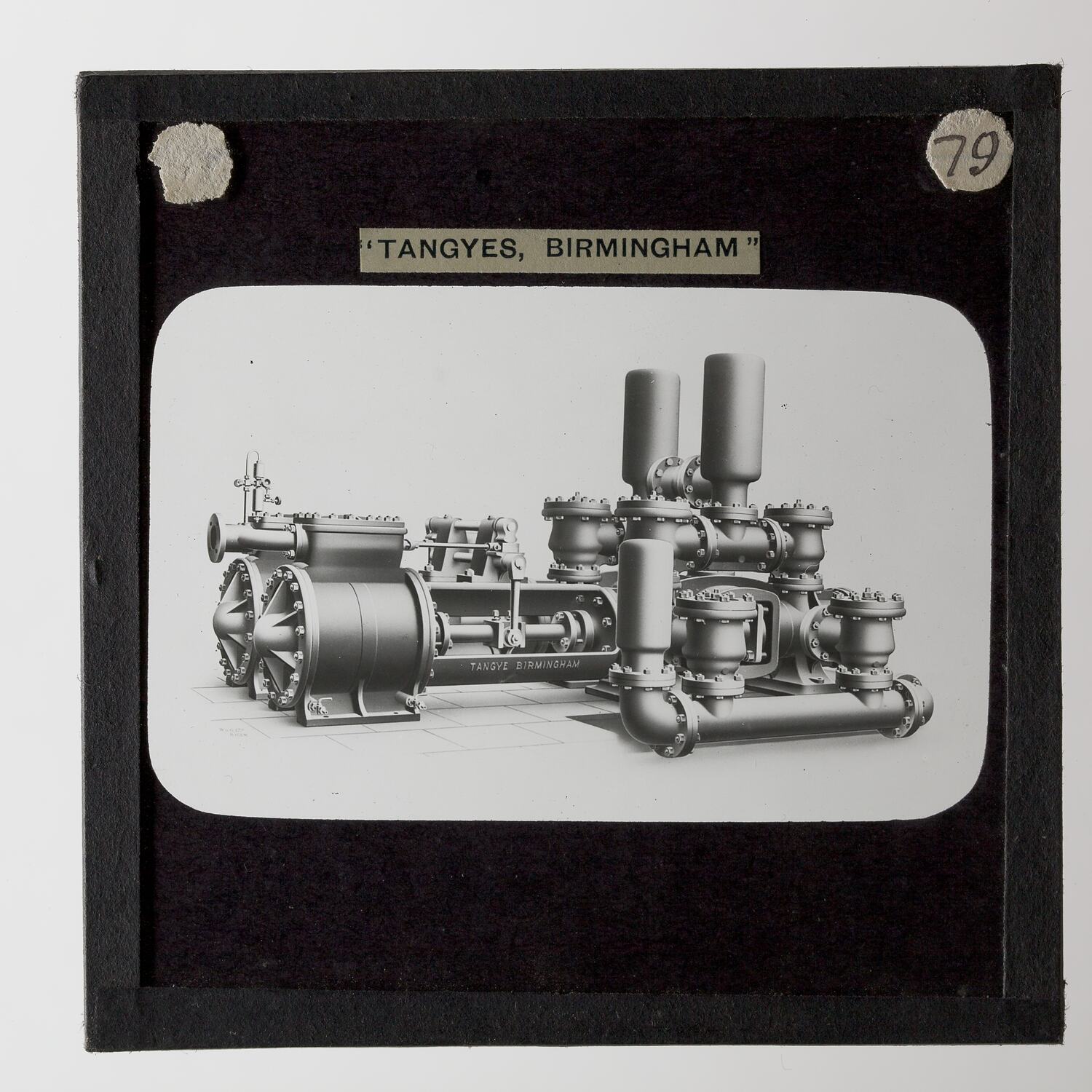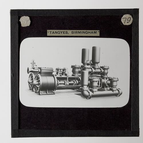 One of 239 glass lantern slides depicting products manufactured by Tangyes Limited engineers of Birmingham, England. The images include various products such as engines, centrifugal pumps, hydraulic pumps, gas producers, materials testing machines, presses, machine tools, hydraulic jacks etc. Tangyes was a company which operated from 1857 to 1957. They produced a wide variety of engineering products exported worldwide including Australia and other British colonies.
