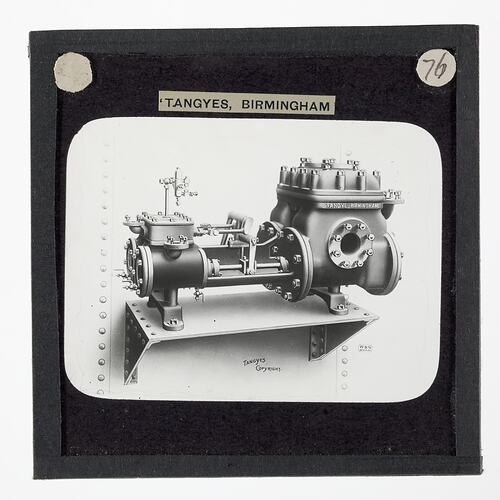 Text printed in black ink on white adhesive paper label over black mask: "TANGYES, BIRMINGHAM"