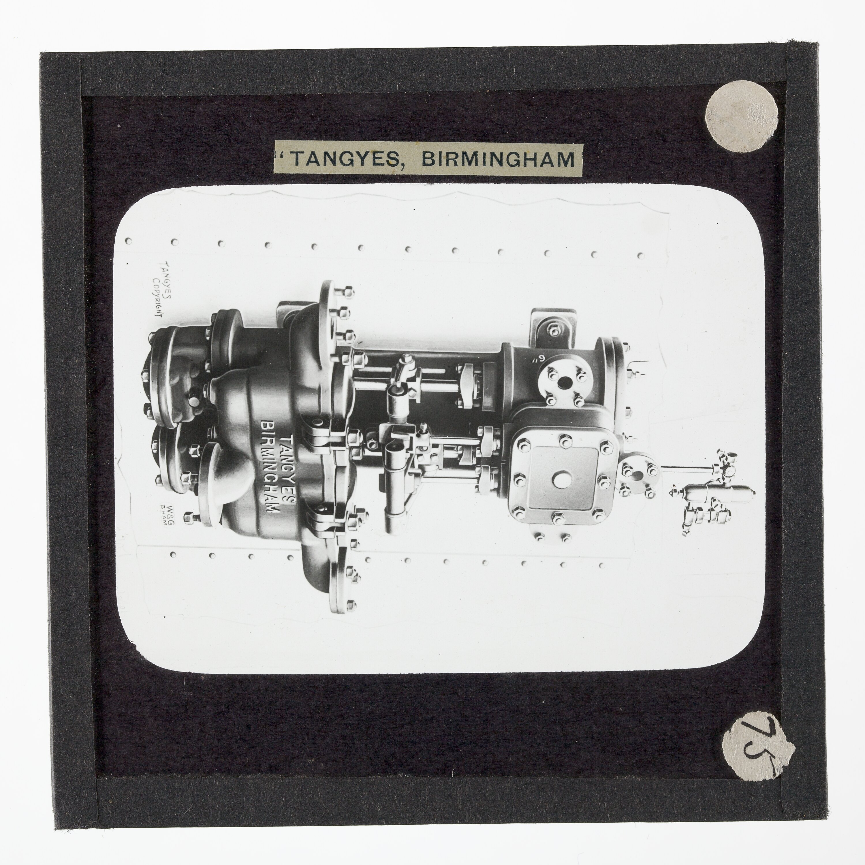 One of 239 glass lantern slides depicting products manufactured by Tangyes Limited engineers of Birmingham, England. The images include various products such as engines, centrifugal pumps, hydraulic pumps, gas producers, materials testing machines, presses, machine tools, hydraulic jacks etc. Tangyes was a company which operated from 1857 to 1957. They produced a wide variety of engineering products exported worldwide including Australia and other British colonies.
