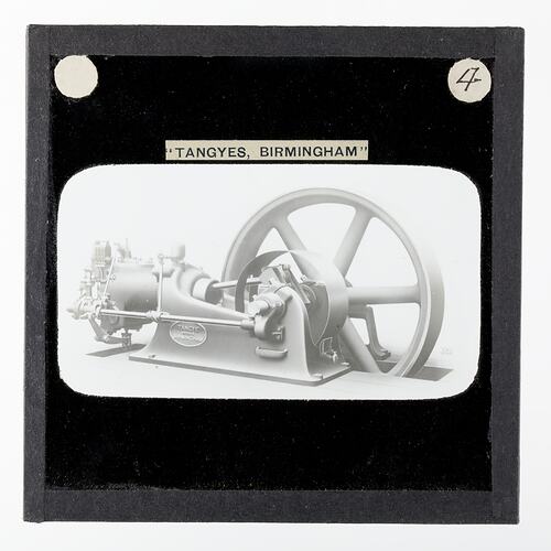 One of 239 glass lantern slides depicting products manufactured by Tangyes Limited engineers of Birmingham, England. The images include various products such as engines, centrifugal pumps, hydraulic pumps, gas producers, materials testing machines, presses, machine tools, hydraulic jacks etc. Tangyes was a company which operated from 1857 to 1957. They produced a wide variety of engineering products exported worldwide including Australia and other British colonies.