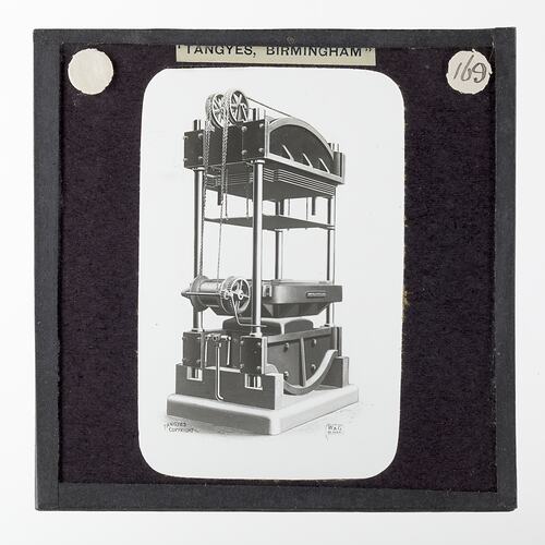 One of 239 glass lantern slides depicting products manufactured by Tangyes Limited engineers of Birmingham, England. The images include various products such as engines, centrifugal pumps, hydraulic pumps, gas producers, materials testing machines, presses, machine tools, hydraulic jacks etc. Tangyes was a company which operated from 1857 to 1957. They produced a wide variety of engineering products exported worldwide including Australia and other British colonies.