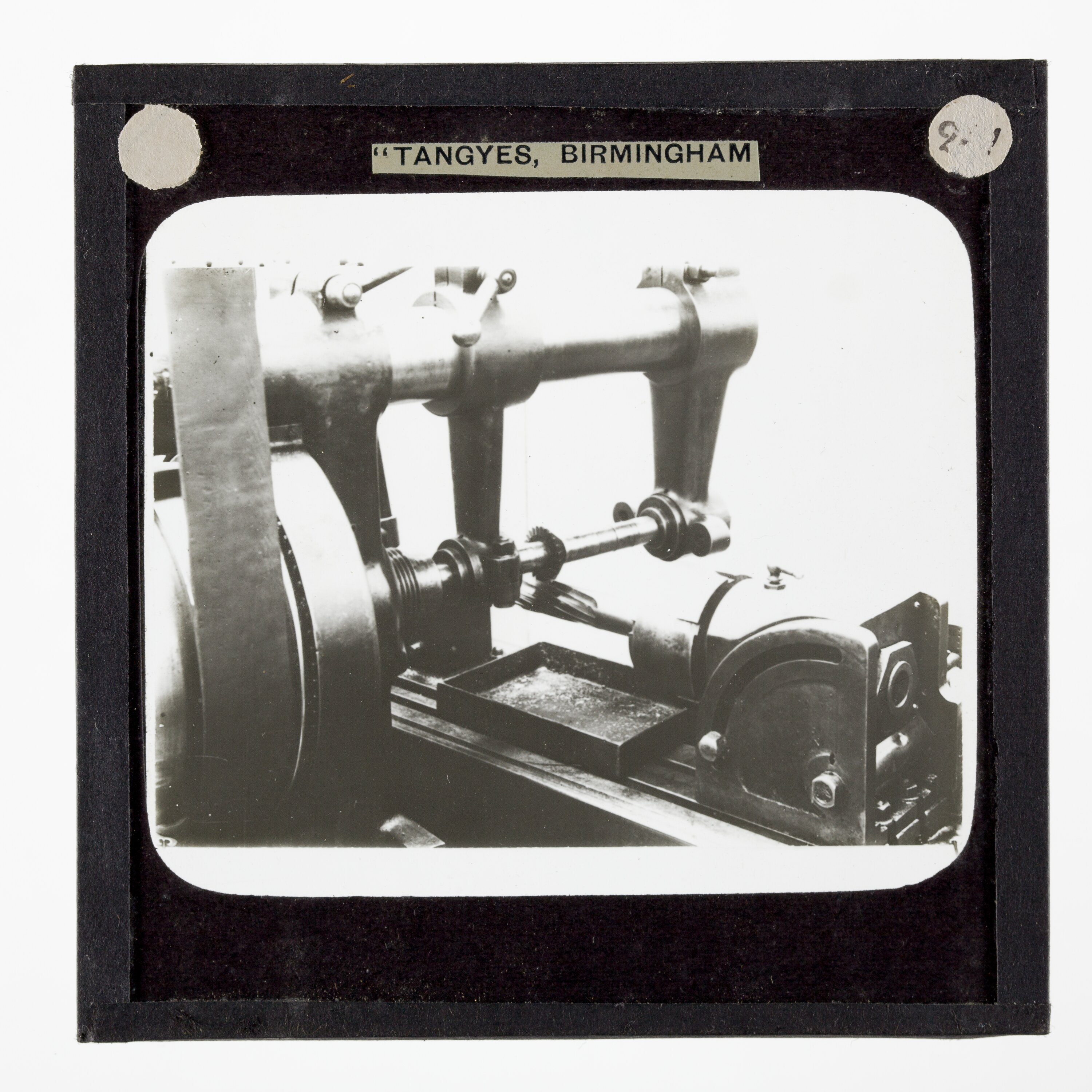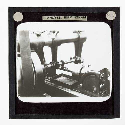 One of 239 glass lantern slides depicting products manufactured by Tangyes Limited engineers of Birmingham, England. The images include various products such as engines, centrifugal pumps, hydraulic pumps, gas producers, materials testing machines, presses, machine tools, hydraulic jacks etc. Tangyes was a company which operated from 1857 to 1957. They produced a wide variety of engineering products exported worldwide including Australia and other British colonies.