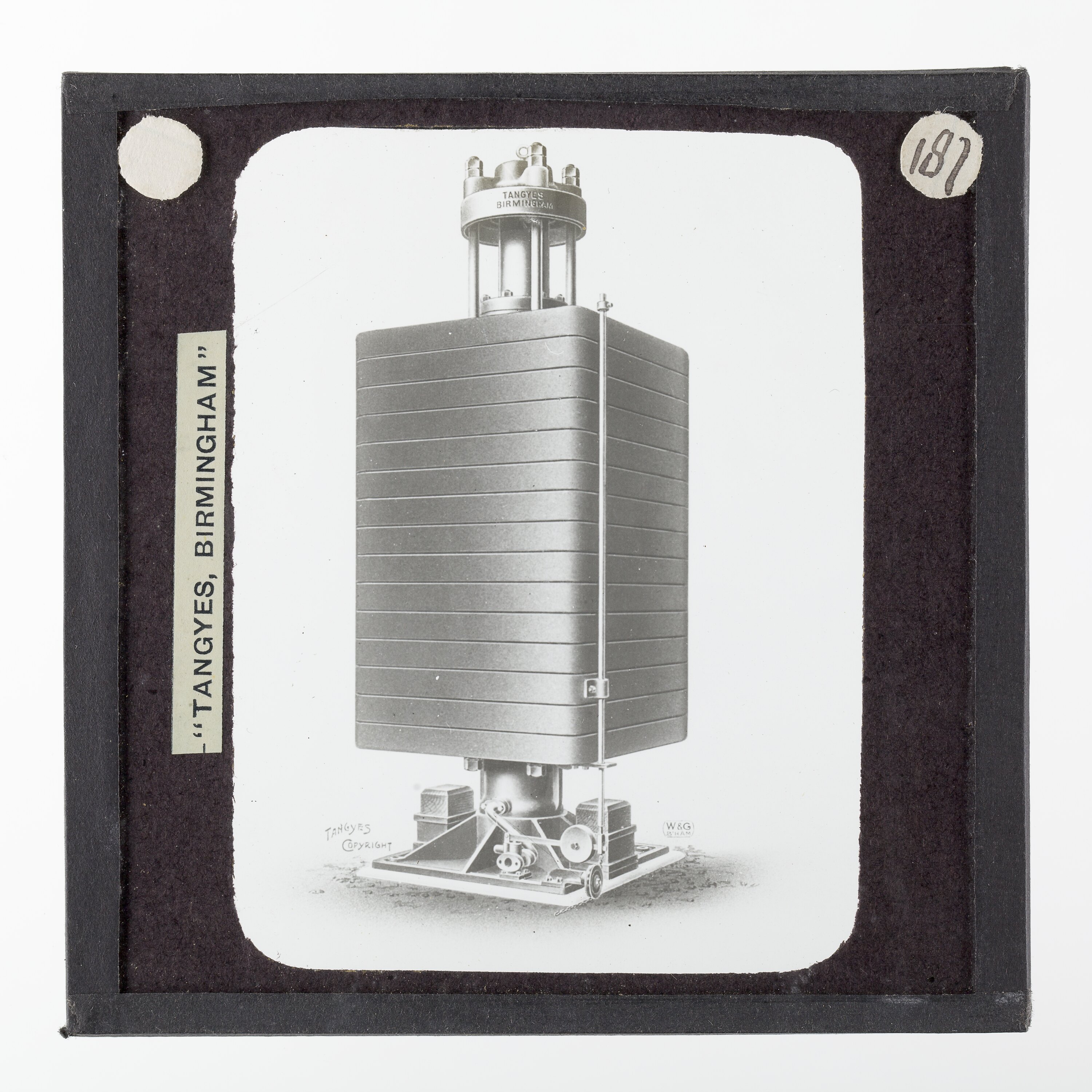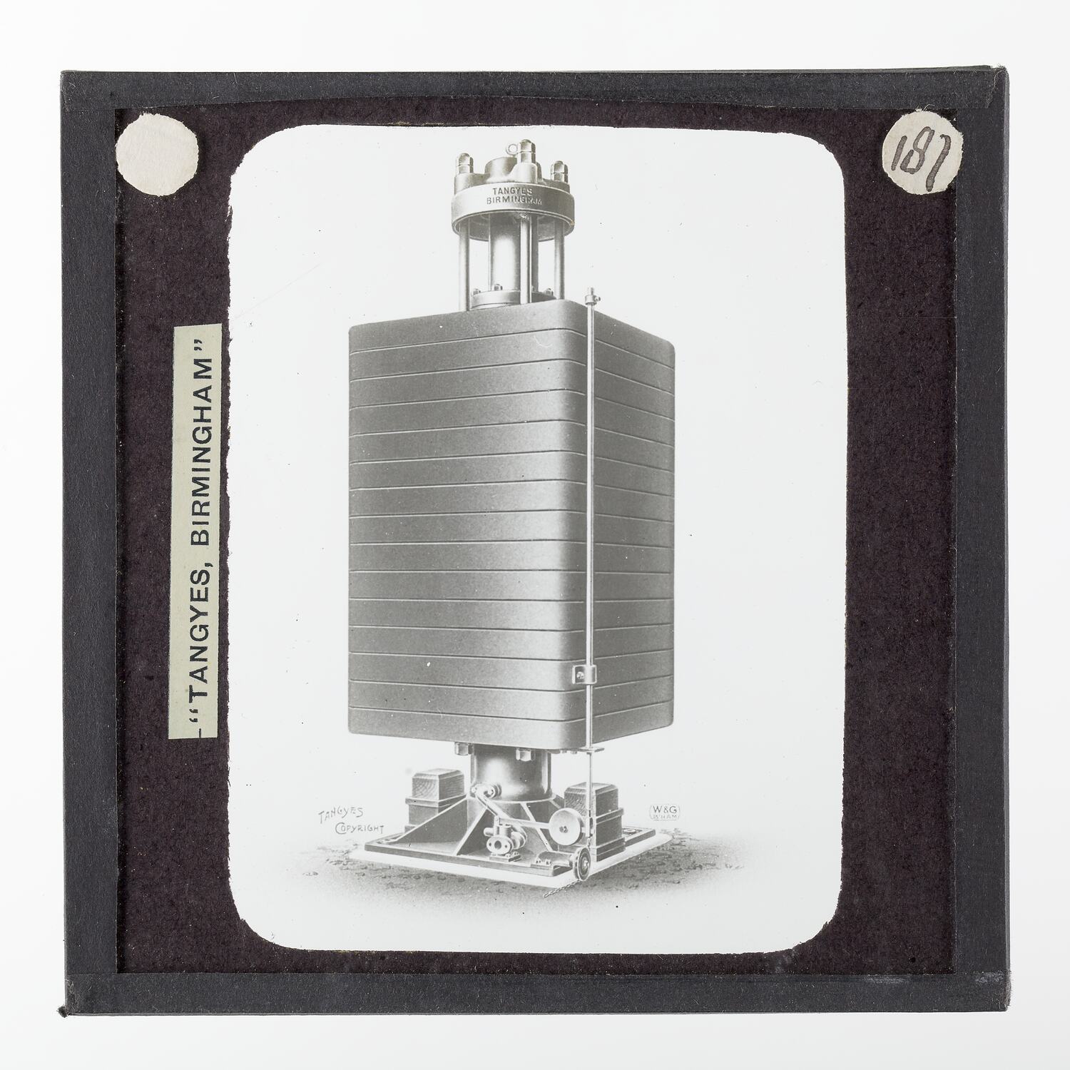 One of 239 glass lantern slides depicting products manufactured by Tangyes Limited engineers of Birmingham, England. The images include various products such as engines, centrifugal pumps, hydraulic pumps, gas producers, materials testing machines, presses, machine tools, hydraulic jacks etc. Tangyes was a company which operated from 1857 to 1957. They produced a wide variety of engineering products exported worldwide including Australia and other British colonies.