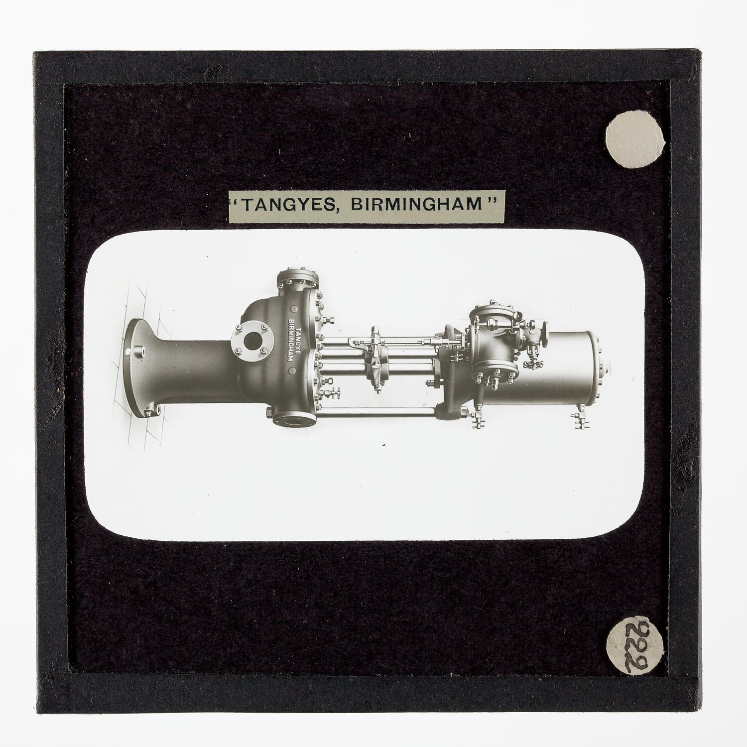 One of 239 glass lantern slides depicting products manufactured by Tangyes Limited engineers of Birmingham, England. The images include various products such as engines, centrifugal pumps, hydraulic pumps, gas producers, materials testing machines, presses, machine tools, hydraulic jacks etc. Tangyes was a company which operated from 1857 to 1957. They produced a wide variety of engineering products exported worldwide including Australia and other British colonies.