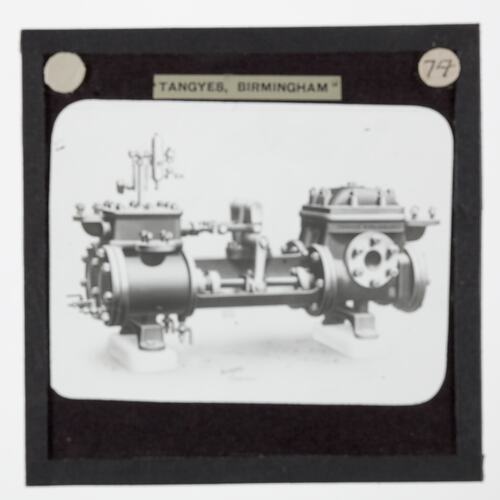 One of 239 glass lantern slides depicting products manufactured by Tangyes Limited engineers of Birmingham, England. The images include various products such as engines, centrifugal pumps, hydraulic pumps, gas producers, materials testing machines, presses, machine tools, hydraulic jacks etc. Tangyes was a company which operated from 1857 to 1957. They produced a wide variety of engineering products exported worldwide including Australia and other British colonies.