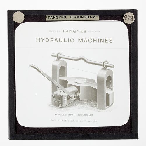 One of 239 glass lantern slides depicting products manufactured by Tangyes Limited engineers of Birmingham, England. The images include various products such as engines, centrifugal pumps, hydraulic pumps, gas producers, materials testing machines, presses, machine tools, hydraulic jacks etc. Tangyes was a company which operated from 1857 to 1957. They produced a wide variety of engineering products exported worldwide including Australia and other British colonies.