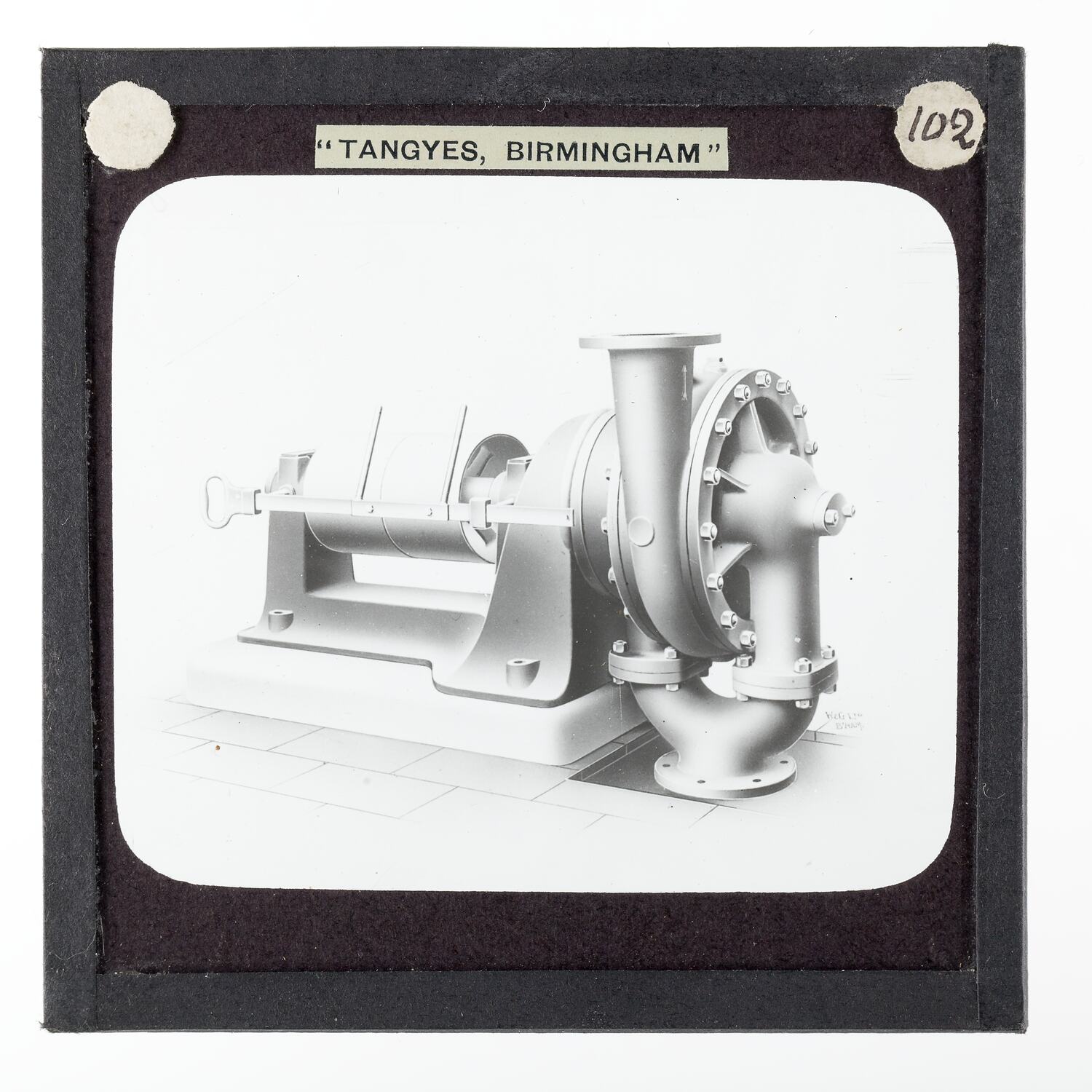 One of 239 glass lantern slides depicting products manufactured by Tangyes Limited engineers of Birmingham, England. The images include various products such as engines, centrifugal pumps, hydraulic pumps, gas producers, materials testing machines, presses, machine tools, hydraulic jacks etc. Tangyes was a company which operated from 1857 to 1957. They produced a wide variety of engineering products exported worldwide including Australia and other British colonies.