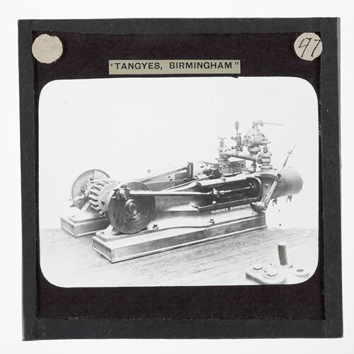 One of 239 glass lantern slides depicting products manufactured by Tangyes Limited engineers of Birmingham, England. The images include various products such as engines, centrifugal pumps, hydraulic pumps, gas producers, materials testing machines, presses, machine tools, hydraulic jacks etc. Tangyes was a company which operated from 1857 to 1957. They produced a wide variety of engineering products exported worldwide including Australia and other British colonies.