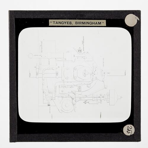One of 239 glass lantern slides depicting products manufactured by Tangyes Limited engineers of Birmingham, England. The images include various products such as engines, centrifugal pumps, hydraulic pumps, gas producers, materials testing machines, presses, machine tools, hydraulic jacks etc. Tangyes was a company which operated from 1857 to 1957. They produced a wide variety of engineering products exported worldwide including Australia and other British colonies.