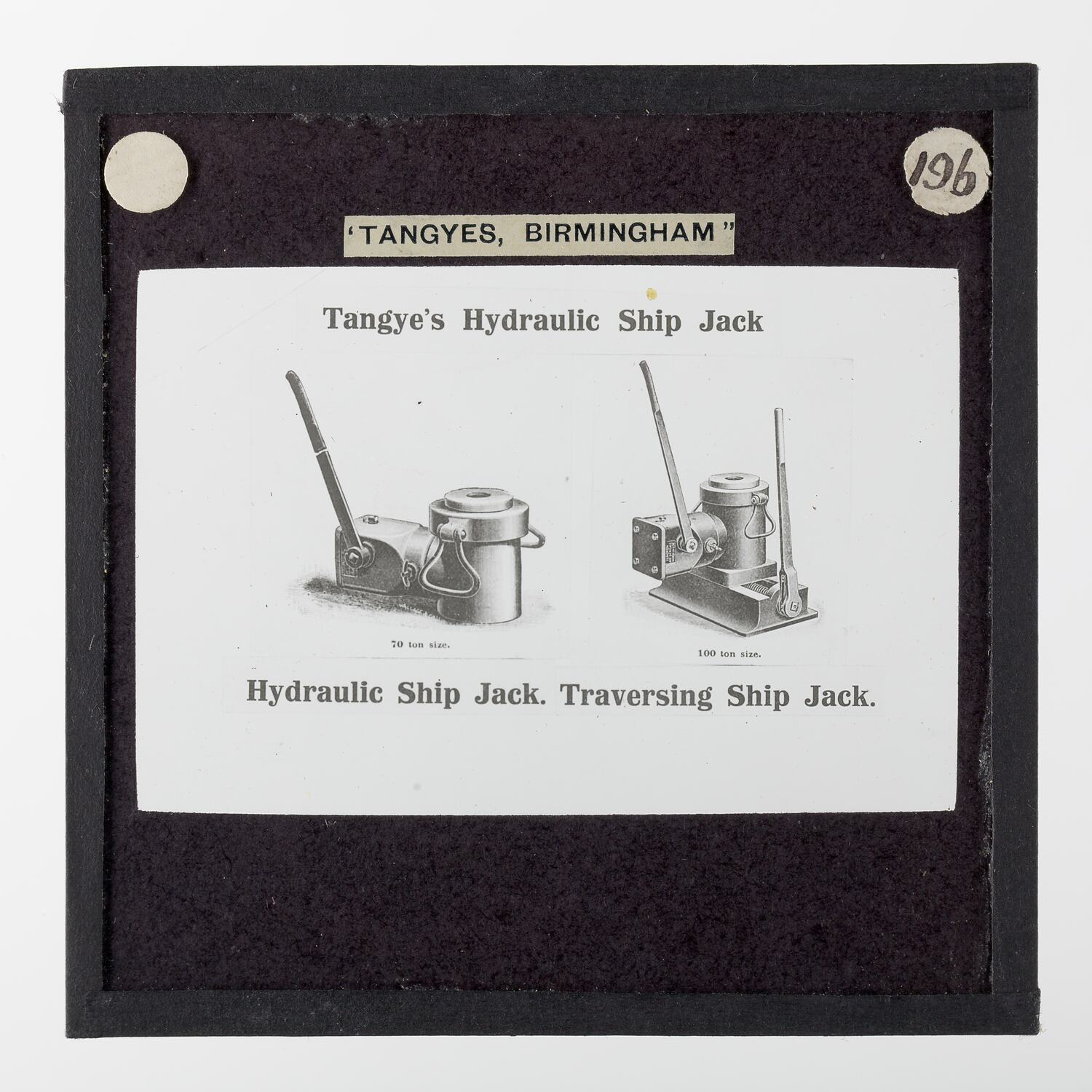 One of 239 glass lantern slides depicting products manufactured by Tangyes Limited engineers of Birmingham, England. The images include various products such as engines, centrifugal pumps, hydraulic pumps, gas producers, materials testing machines, presses, machine tools, hydraulic jacks etc. Tangyes was a company which operated from 1857 to 1957. They produced a wide variety of engineering products exported worldwide including Australia and other British colonies.