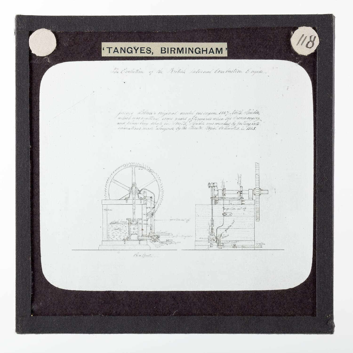 One of 239 glass lantern slides depicting products manufactured by Tangyes Limited engineers of Birmingham, England. The images include various products such as engines, centrifugal pumps, hydraulic pumps, gas producers, materials testing machines, presses, machine tools, hydraulic jacks etc. Tangyes was a company which operated from 1857 to 1957. They produced a wide variety of engineering products exported worldwide including Australia and other British colonies.