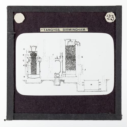 It is thought that this collection of magic lantern slides was used by a local agent for sales purposes. These images were originally used to illustrate Tangyes Ltd product catalogues from the period 1910 - circa 1920s.
