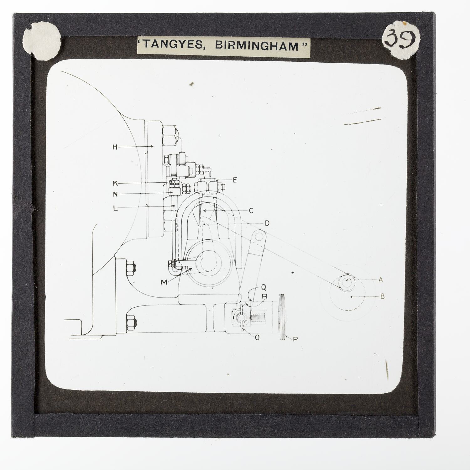 Text printed in black ink on white adhesive paper label over black mask: "TANGYES, BIRMINGHAM"
