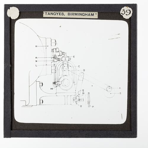 One of 239 glass lantern slides depicting products manufactured by Tangyes Limited engineers of Birmingham, England. The images include various products such as engines, centrifugal pumps, hydraulic pumps, gas producers, materials testing machines, presses, machine tools, hydraulic jacks etc. Tangyes was a company which operated from 1857 to 1957. They produced a wide variety of engineering products exported worldwide including Australia and other British colonies.