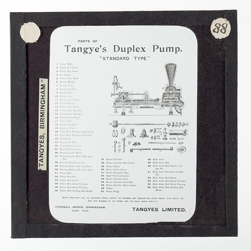 One of 239 glass lantern slides depicting products manufactured by Tangyes Limited engineers of Birmingham, England. The images include various products such as engines, centrifugal pumps, hydraulic pumps, gas producers, materials testing machines, presses, machine tools, hydraulic jacks etc. Tangyes was a company which operated from 1857 to 1957. They produced a wide variety of engineering products exported worldwide including Australia and other British colonies.