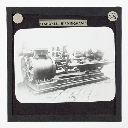 One of 239 glass lantern slides depicting products manufactured by Tangyes Limited engineers of Birmingham, England. The images include various products such as engines, centrifugal pumps, hydraulic pumps, gas producers, materials testing machines, presses, machine tools, hydraulic jacks etc. Tangyes was a company which operated from 1857 to 1957. They produced a wide variety of engineering products exported worldwide including Australia and other British colonies.