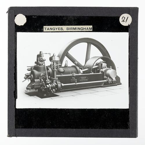 One of 239 glass lantern slides depicting products manufactured by Tangyes Limited engineers of Birmingham, England. The images include various products such as engines, centrifugal pumps, hydraulic pumps, gas producers, materials testing machines, presses, machine tools, hydraulic jacks etc. Tangyes was a company which operated from 1857 to 1957. They produced a wide variety of engineering products exported worldwide including Australia and other British colonies.