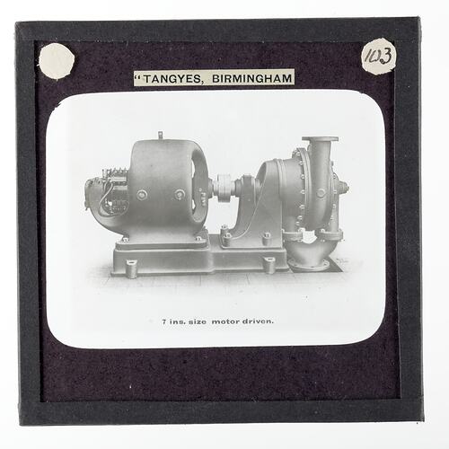 One of 239 glass lantern slides depicting products manufactured by Tangyes Limited engineers of Birmingham, England. The images include various products such as engines, centrifugal pumps, hydraulic pumps, gas producers, materials testing machines, presses, machine tools, hydraulic jacks etc. Tangyes was a company which operated from 1857 to 1957. They produced a wide variety of engineering products exported worldwide including Australia and other British colonies.