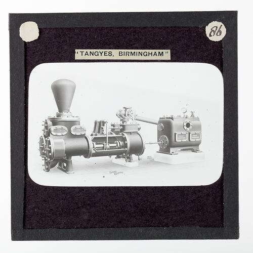 One of 239 glass lantern slides depicting products manufactured by Tangyes Limited engineers of Birmingham, England. The images include various products such as engines, centrifugal pumps, hydraulic pumps, gas producers, materials testing machines, presses, machine tools, hydraulic jacks etc. Tangyes was a company which operated from 1857 to 1957. They produced a wide variety of engineering products exported worldwide including Australia and other British colonies.