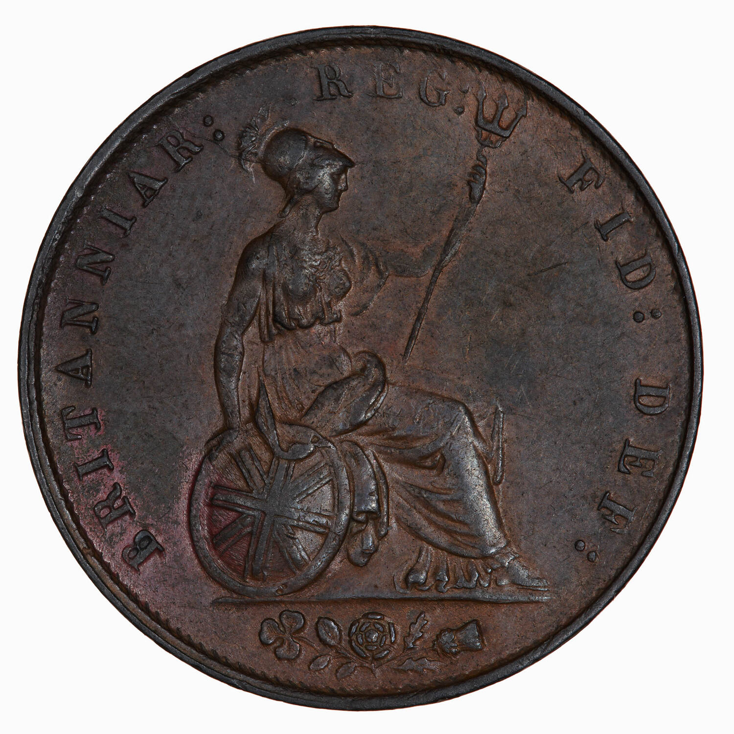 Britannia seated facing right on a rock holding a trident and resting her right hand on an oval shield which bears the three crosses of the Union Flag; around, BRITANNIAR: REG: FID: DEF:; in exergue, a rose, thistle and shamrock combined.