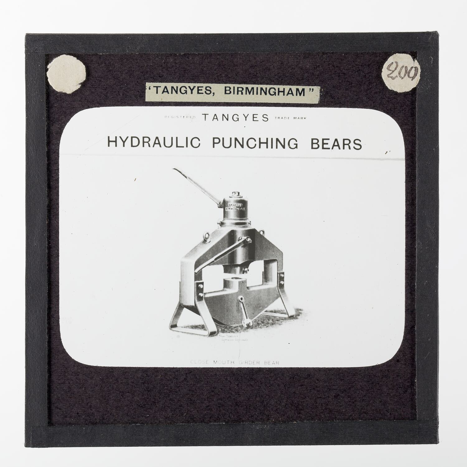 One of 239 glass lantern slides depicting products manufactured by Tangyes Limited engineers of Birmingham, England. The images include various products such as engines, centrifugal pumps, hydraulic pumps, gas producers, materials testing machines, presses, machine tools, hydraulic jacks etc. Tangyes was a company which operated from 1857 to 1957. They produced a wide variety of engineering products exported worldwide including Australia and other British colonies.