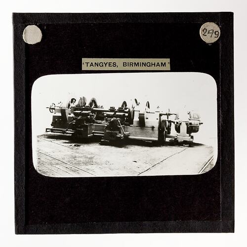 One of 239 glass lantern slides depicting products manufactured by Tangyes Limited engineers of Birmingham, England. The images include various products such as engines, centrifugal pumps, hydraulic pumps, gas producers, materials testing machines, presses, machine tools, hydraulic jacks etc. Tangyes was a company which operated from 1857 to 1957. They produced a wide variety of engineering products exported worldwide including Australia and other British colonies.