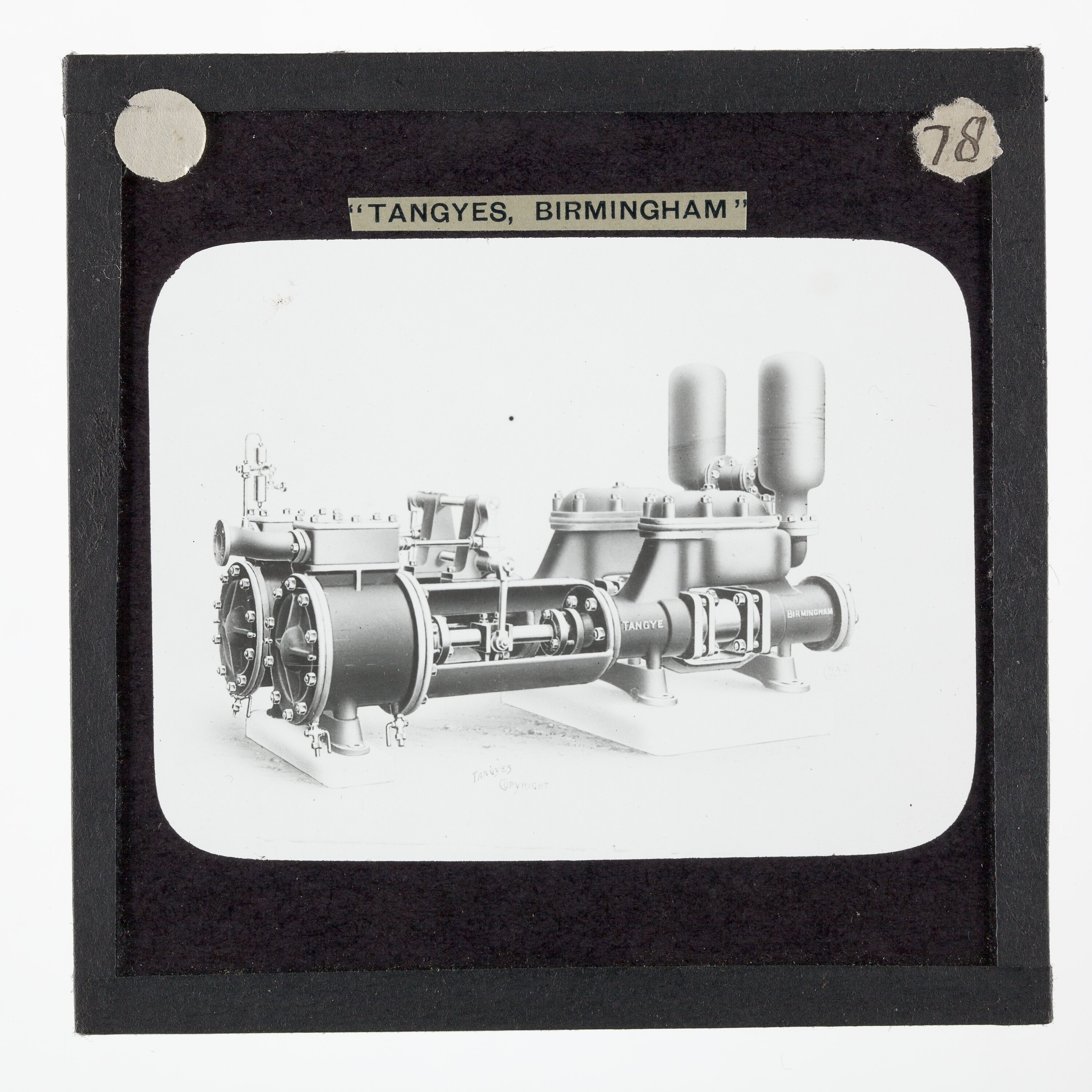 One of 239 glass lantern slides depicting products manufactured by Tangyes Limited engineers of Birmingham, England. The images include various products such as engines, centrifugal pumps, hydraulic pumps, gas producers, materials testing machines, presses, machine tools, hydraulic jacks etc. Tangyes was a company which operated from 1857 to 1957. They produced a wide variety of engineering products exported worldwide including Australia and other British colonies.