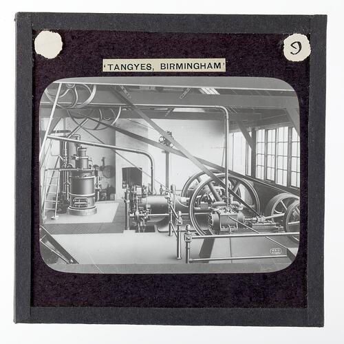 One of 239 glass lantern slides depicting products manufactured by Tangyes Limited engineers of Birmingham, England. The images include various products such as engines, centrifugal pumps, hydraulic pumps, gas producers, materials testing machines, presses, machine tools, hydraulic jacks etc. Tangyes was a company which operated from 1857 to 1957. They produced a wide variety of engineering products exported worldwide including Australia and other British colonies.