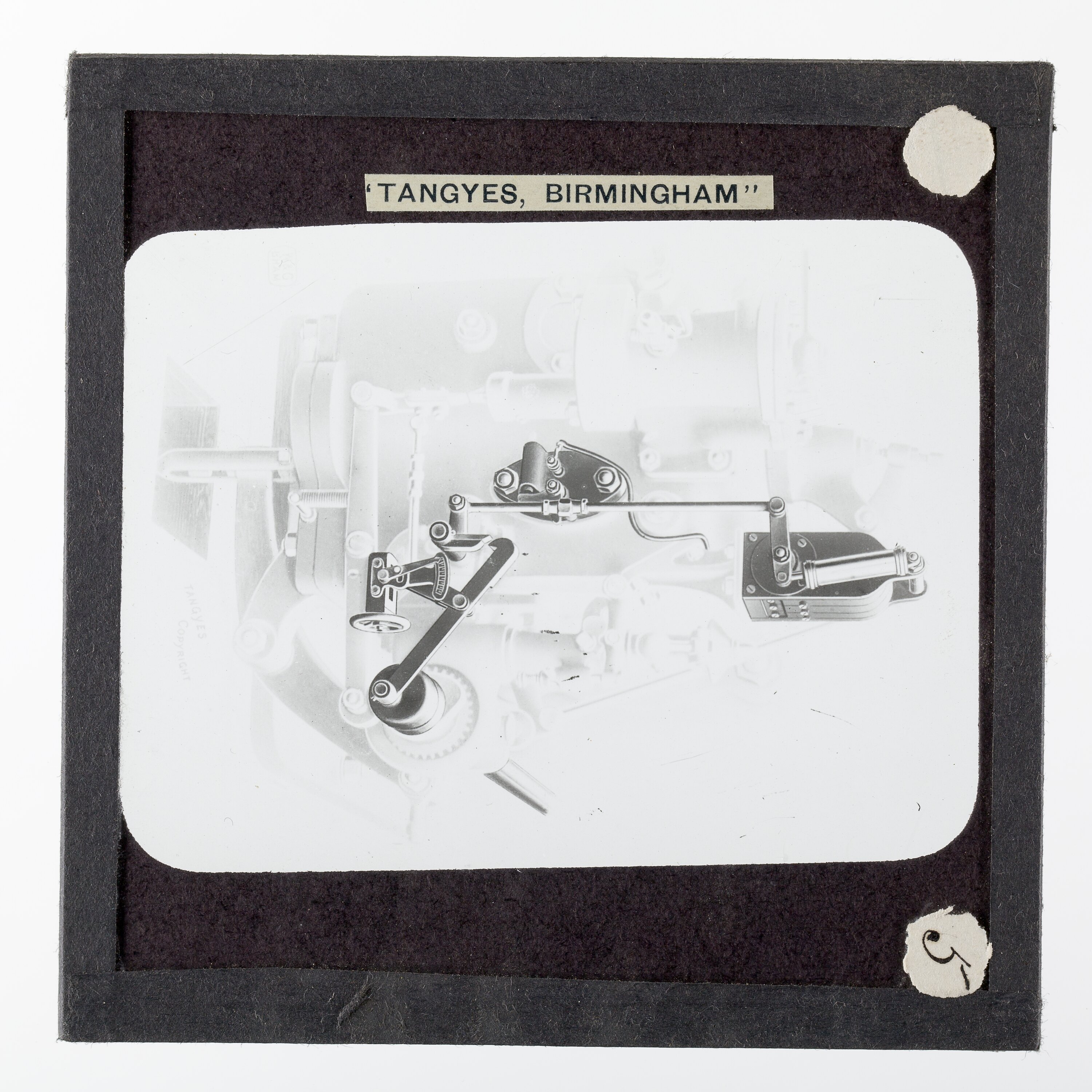 One of 239 glass lantern slides depicting products manufactured by Tangyes Limited engineers of Birmingham, England. The images include various products such as engines, centrifugal pumps, hydraulic pumps, gas producers, materials testing machines, presses, machine tools, hydraulic jacks etc. Tangyes was a company which operated from 1857 to 1957. They produced a wide variety of engineering products exported worldwide including Australia and other British colonies.