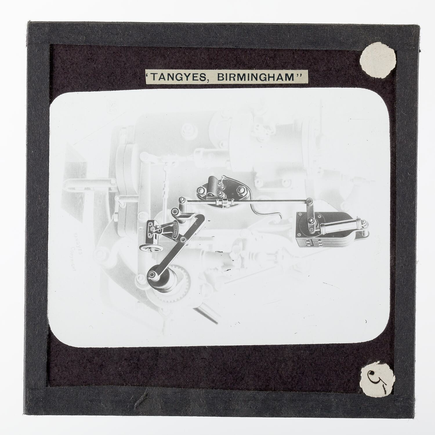 Black and white lantern slide of a Tangye gas engine magneto and igniter.