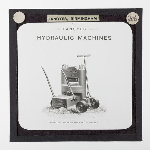 One of 239 glass lantern slides depicting products manufactured by Tangyes Limited engineers of Birmingham, England. The images include various products such as engines, centrifugal pumps, hydraulic pumps, gas producers, materials testing machines, presses, machine tools, hydraulic jacks etc. Tangyes was a company which operated from 1857 to 1957. They produced a wide variety of engineering products exported worldwide including Australia and other British colonies.