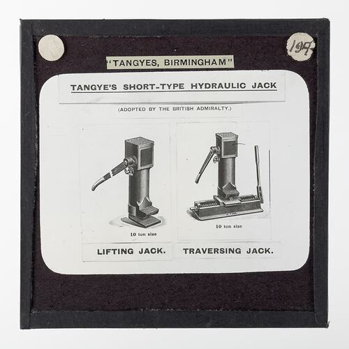 One of 239 glass lantern slides depicting products manufactured by Tangyes Limited engineers of Birmingham, England. The images include various products such as engines, centrifugal pumps, hydraulic pumps, gas producers, materials testing machines, presses, machine tools, hydraulic jacks etc. Tangyes was a company which operated from 1857 to 1957. They produced a wide variety of engineering products exported worldwide including Australia and other British colonies.