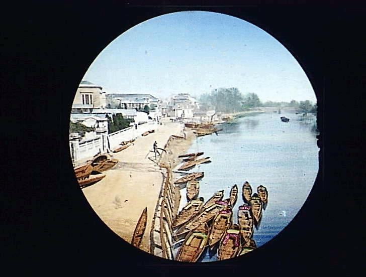 This type of glass slide in a wooden frame was used to project a static image such as a scene, the words of a song or joke, a scientific instrument and so on. This slide is a tinted photograph of the seaside at Kew, England.
