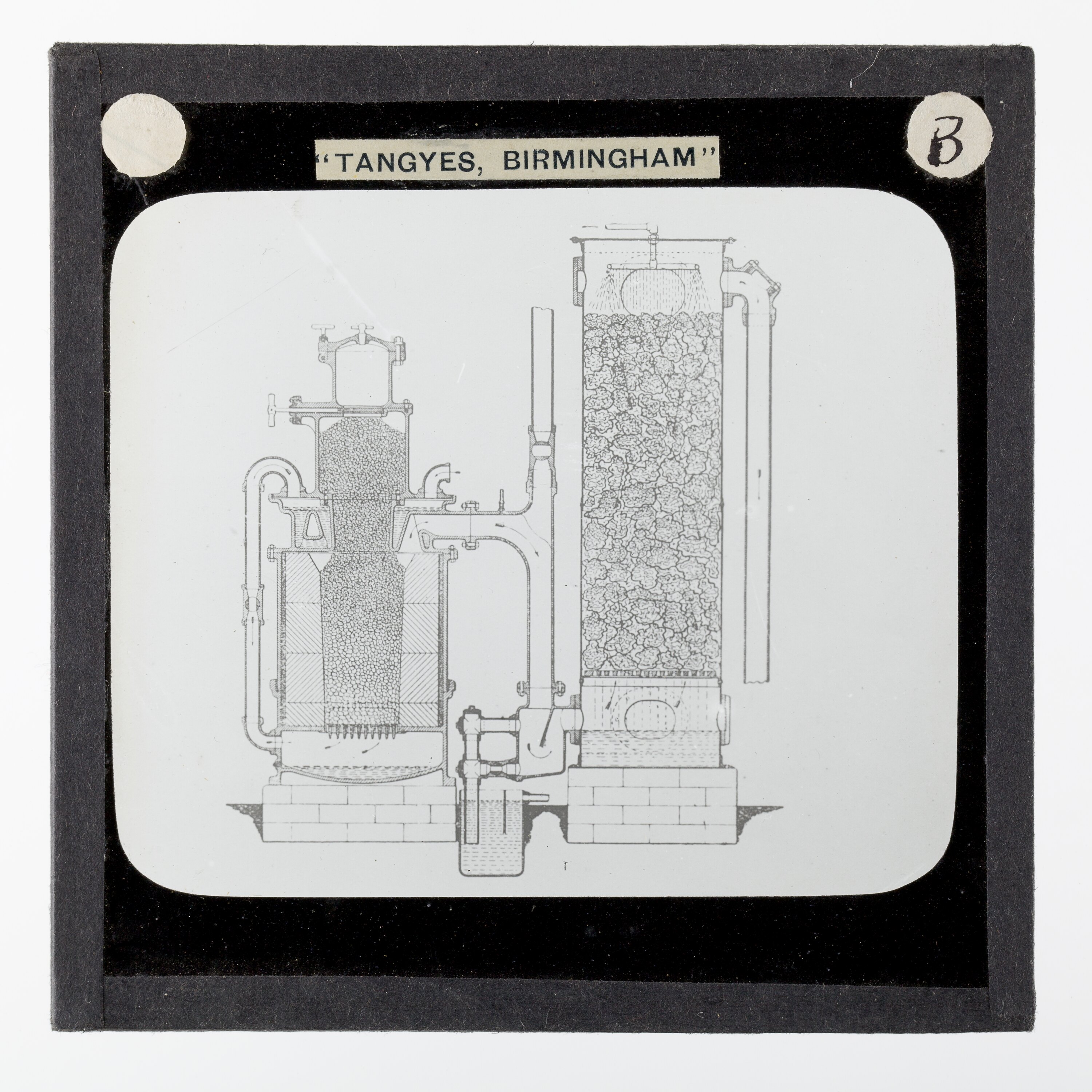 It is thought that this collection of magic lantern slides was used by a local agent for sales purposes. These images were also used to illustrate Tangyes Ltd product catalogues from the period 1910 - circa 1920s.