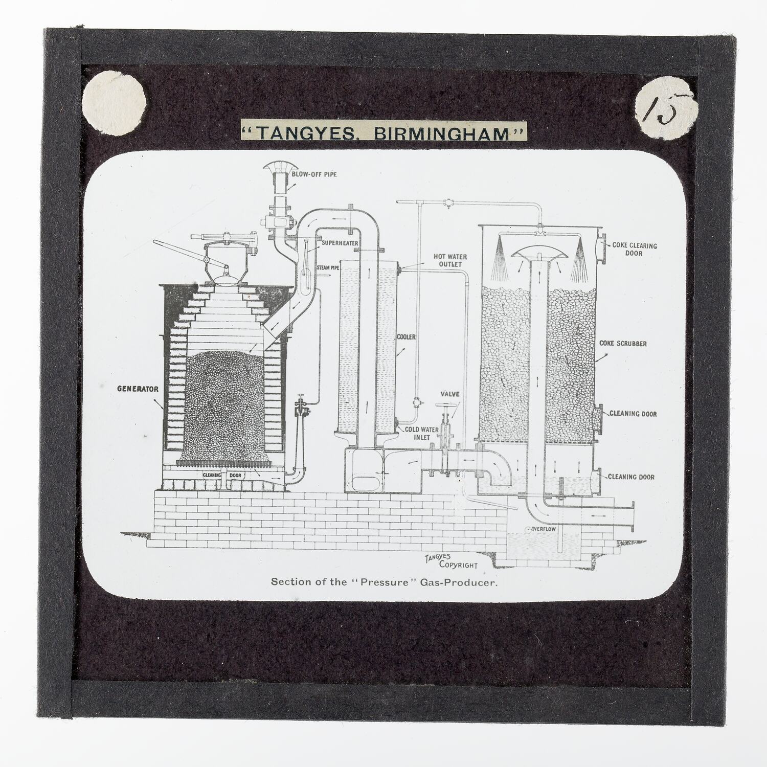 Text: 'Section of the "Pressure" Gas-Producer'. Text printed in black ink on white adhesive paper label over black mask: "TANGYES, BIRMINGHAM"