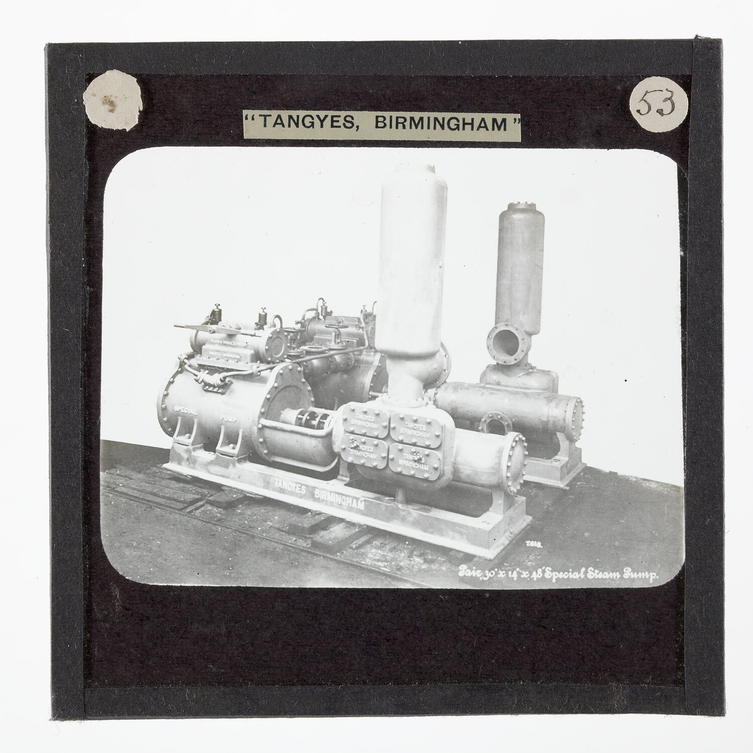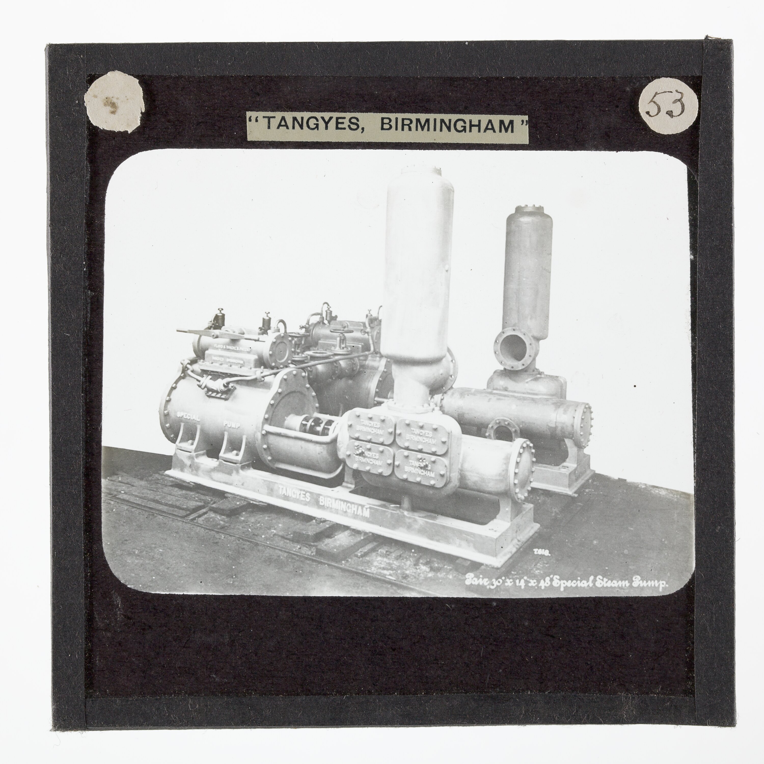 One of 239 glass lantern slides depicting products manufactured by Tangyes Limited engineers of Birmingham, England. The images include various products such as engines, centrifugal pumps, hydraulic pumps, gas producers, materials testing machines, presses, machine tools, hydraulic jacks etc. Tangyes was a company which operated from 1857 to 1957. They produced a wide variety of engineering products exported worldwide including Australia and other British colonies.