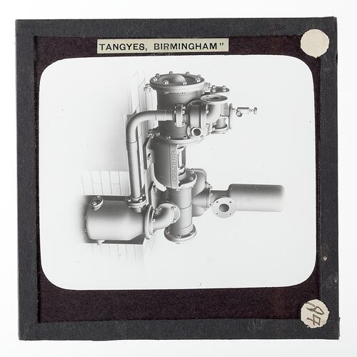 One of 239 glass lantern slides depicting products manufactured by Tangyes Limited engineers of Birmingham, England. The images include various products such as engines, centrifugal pumps, hydraulic pumps, gas producers, materials testing machines, presses, machine tools, hydraulic jacks etc. Tangyes was a company which operated from 1857 to 1957. They produced a wide variety of engineering products exported worldwide including Australia and other British colonies.